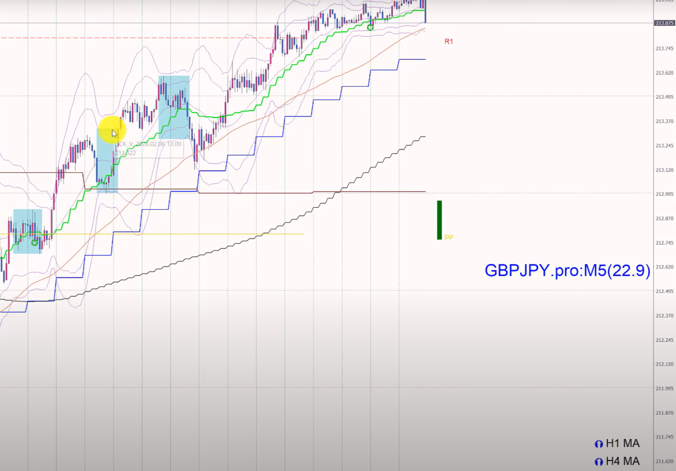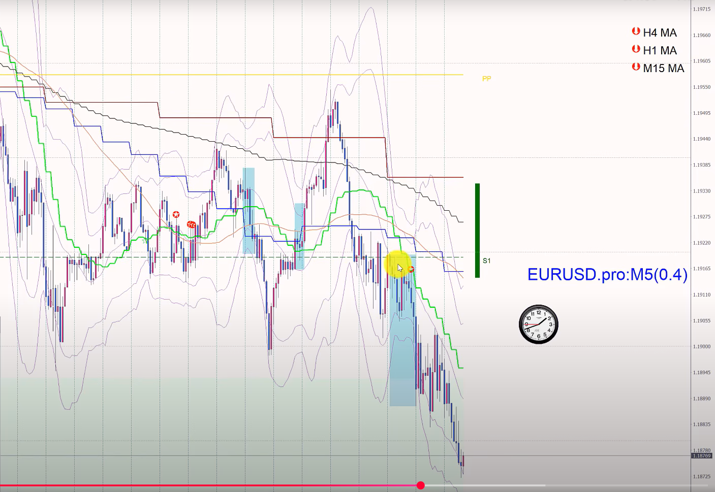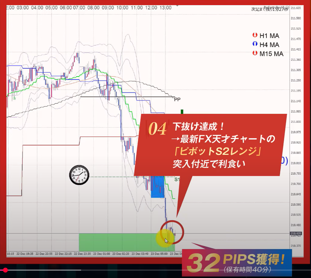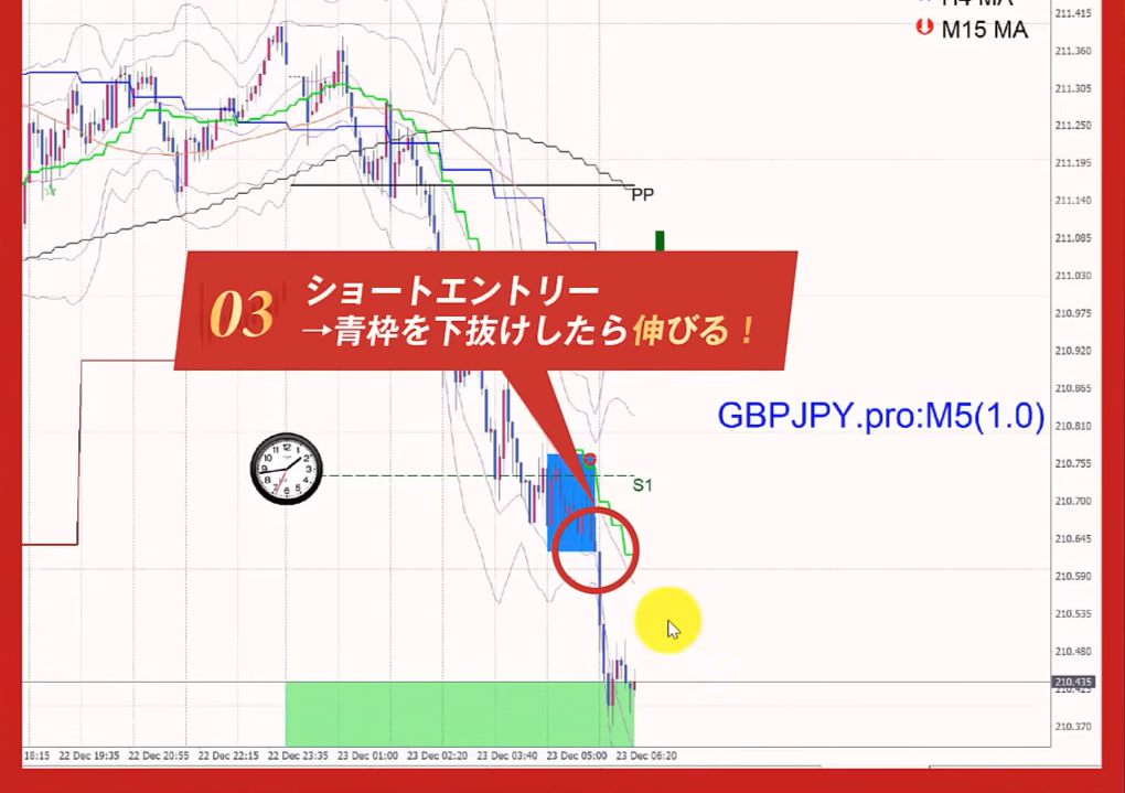 ④ MAタッチ/ BOX下=15分足で入ったら1時間足でナンピン/青枠の下からもしくはブレイクで入って、下にさがったら追加