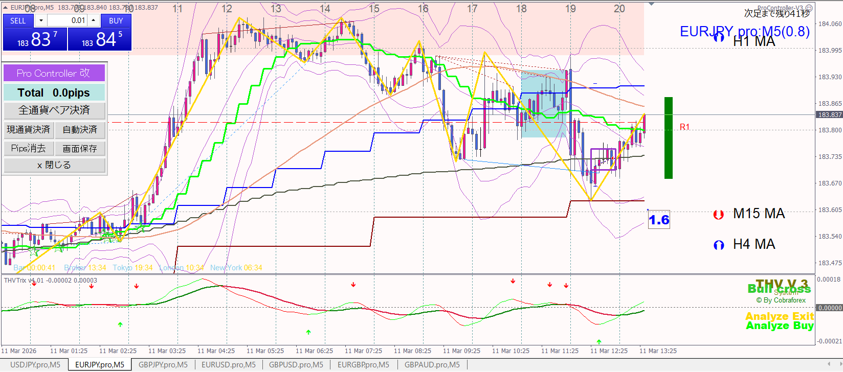 同じタイミングでユーロ円が”4時間足MAも1時間足MAも上昇で、4時間足に戻されてるから押し目”と思いロング