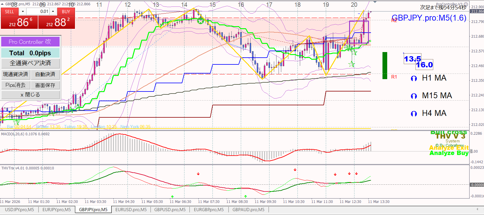 ポンド円が1時間足MAも上向きで、R1で反発して、下げ切らない=”ショートが頑張ってるけど、疲れ果てて上がるかな”と思って19時半くらいにロング