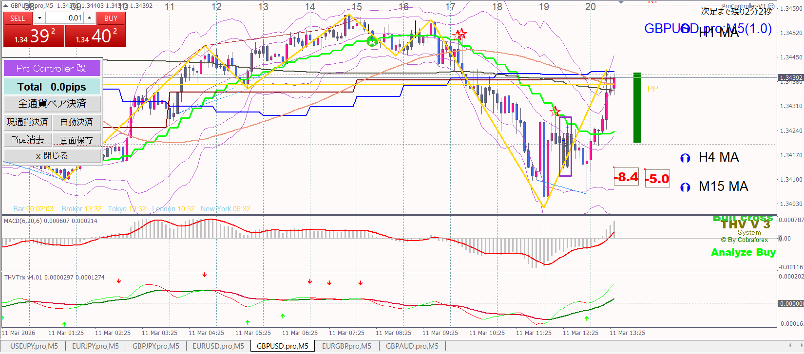 ポンドドルは”再度15分足MAまできたら損切”とおもってたら、上がってきたから損切(四角の枠)