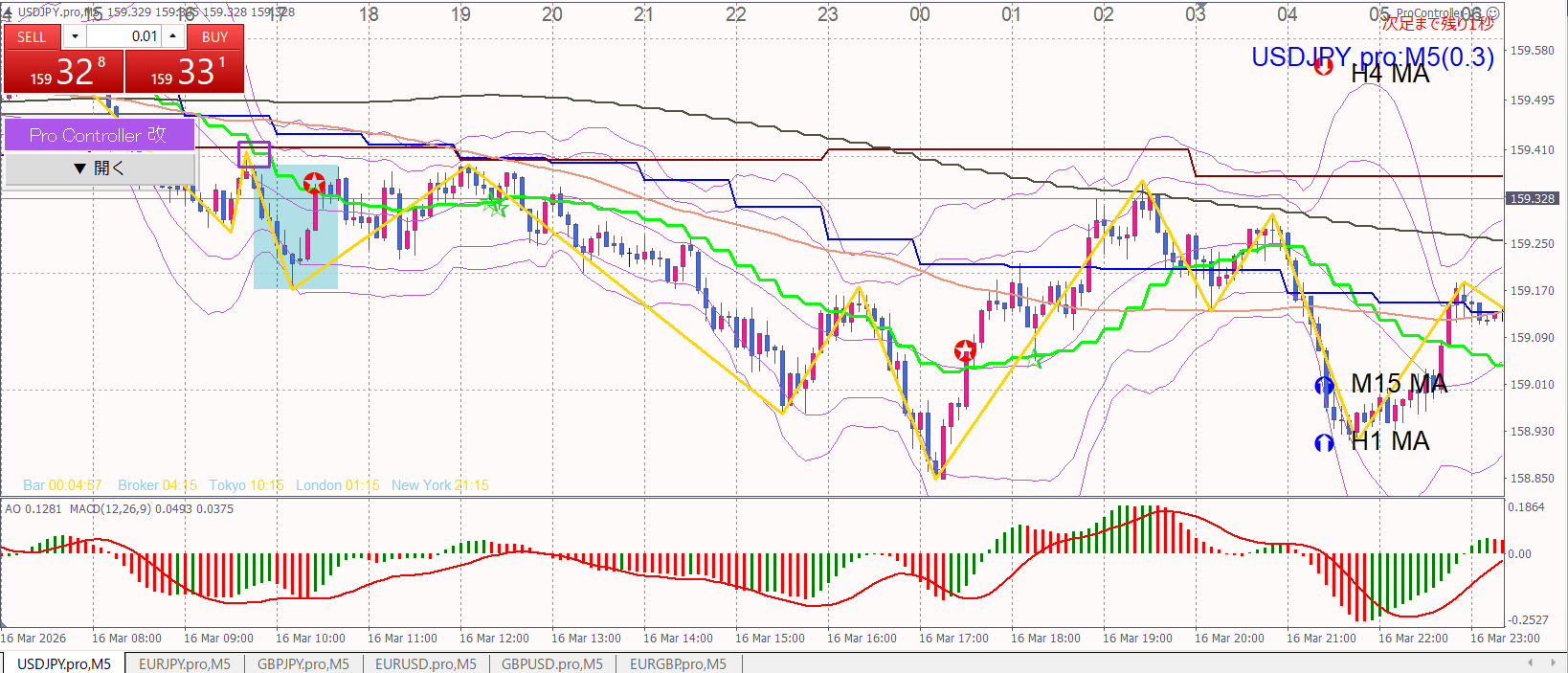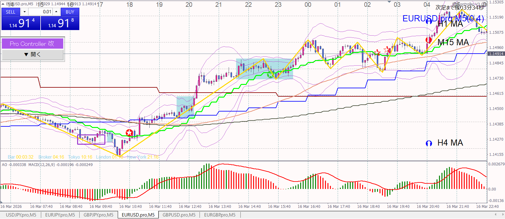 3月16日 ドル円 ユロエン ユロドル →15時50分四角枠 ショート ↓ 実際にエントリーしてたら損切だったね へたくそだなぁ